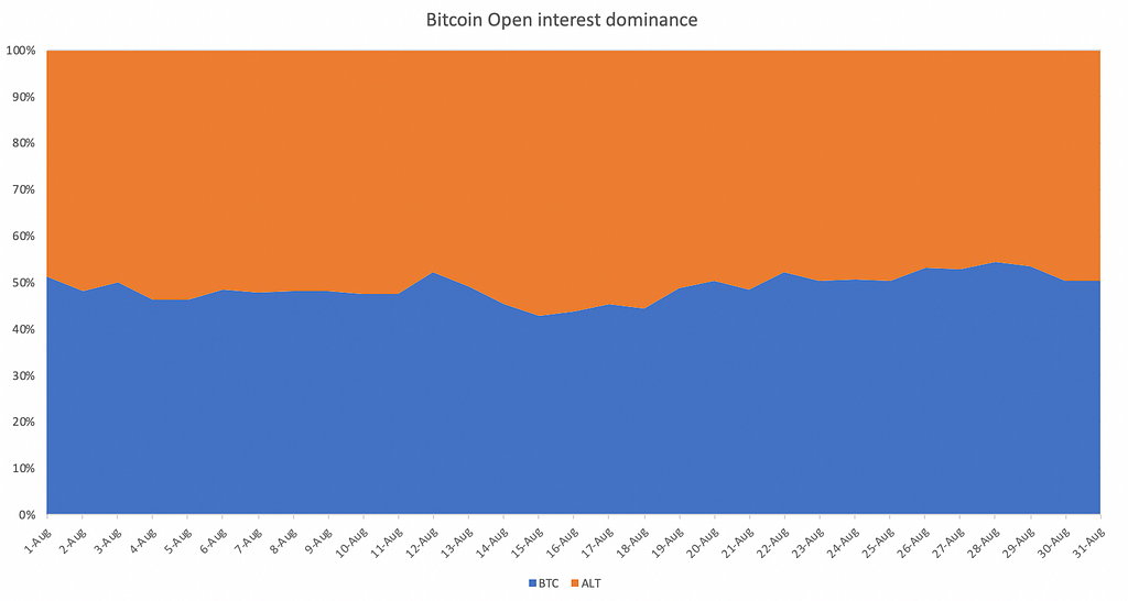 In mid-august, open interest crossed $1 billion again as Bitcoin attempted to break above $12,400. Since then, open interest has stabilized despite the short correction across crypto markets. In fact, the average daily open interest in August has grown to $950 million, a 35% increase vs. $700 million in July.
